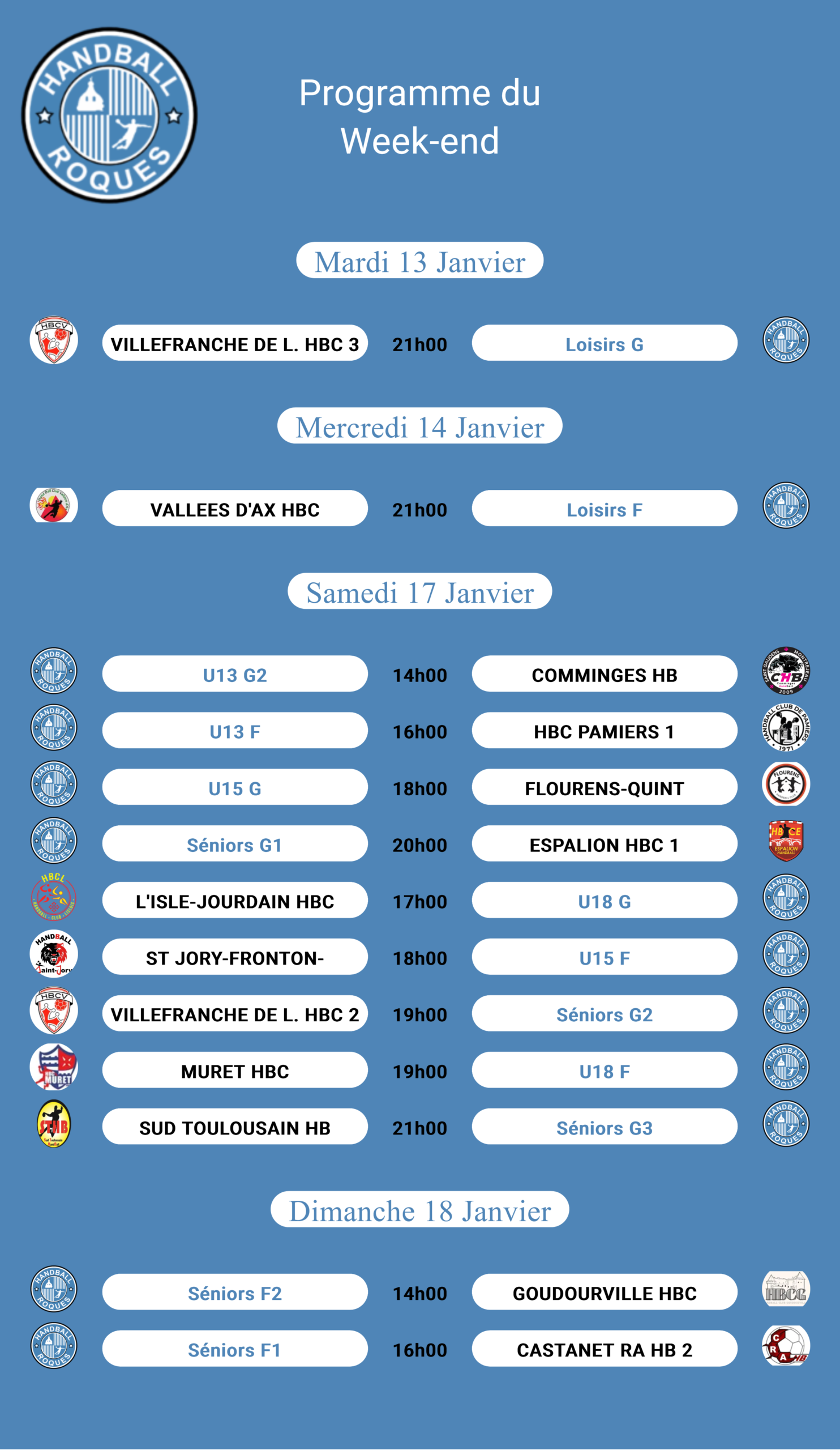 Programme de la semaine 13 janvier 2026 Non Par thierry.lagrange Partager sur Facebook Résultats des matchs Résultats des matchs