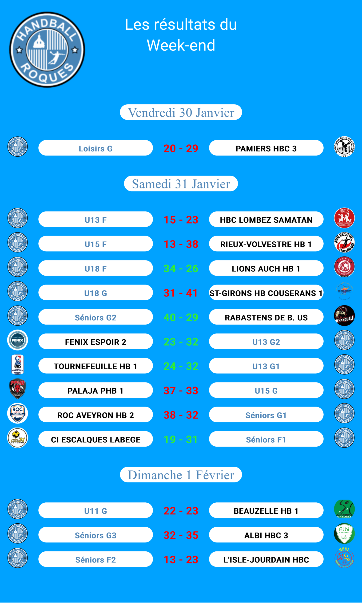 Résultats des matchs 2 février 2026 Non Par thierry.lagrange Partager sur Facebook Programme de la semaine Programme du Week-End